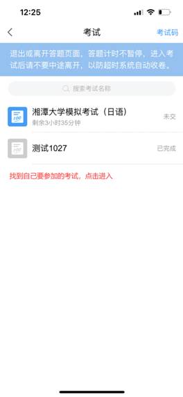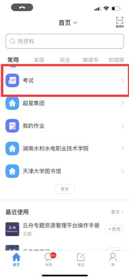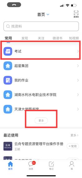 第四点、第一台设备登录上后,点击“首页”—“考试”,点击进去可以看到自己要参加的考试。如果首页没有“考试”,可以点击“更多”,找到“考试”,点击进入考试。