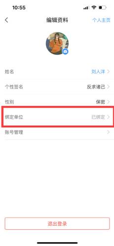 (3)登录上去后,点击“我”,点击向右的箭头,在个人主页中,点击“绑定单位”。